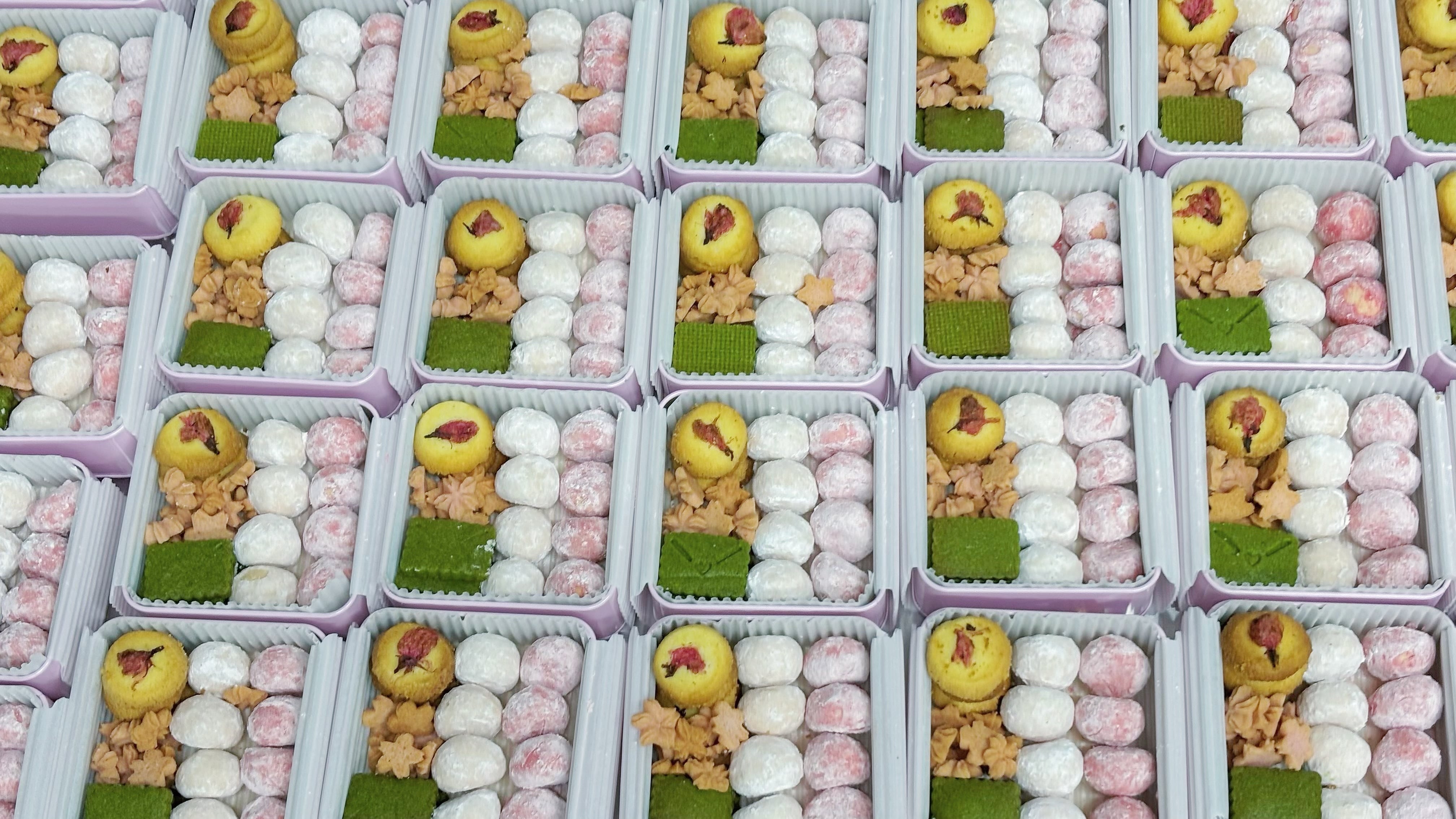 原材料名:小麦粉(国産)、バター、全粒粉、砂糖、鶏卵、桜パウダー(桜ペースト(桜花塩漬、桜葉塩漬)、寒天、砂糖)、いちごパウダー(乳糖、いちご)、アーモンドパウダー、ココアパウダー、シュガーペースト(さとうきび、甜菜、加工でんぷん、粉末水飴)、抹茶、塩/ベーキングパウダー、デキストリン、酸味料、着色料(紅麹)、糊料(ペクチン)、安定剤(加工澱粉)、コチニール色素、香料、キサンタンガム、バニリン