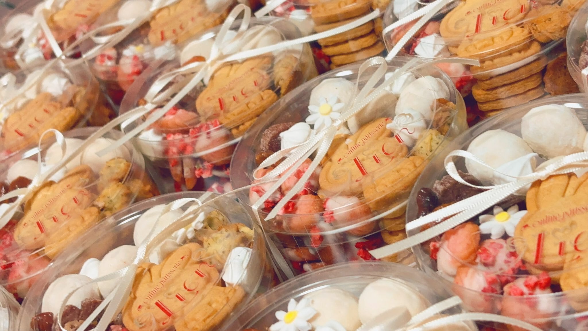 原材料名:小麦粉(国産)、バター、砂糖、鶏卵、カシューナッツ、アーモンド、くるみ、全粒粉、いちごパウダー(乳糖、いちご)、砂糖加工品(グラニュー糖、粉末水飴)、牛乳、ココアパウダー、アールグレイ、塩、コーンシロップ、コーンスターチ/デキストリン、酸味料、着色料(紅麹、黄色4号、黄色5号)、糊料(ペクチン)、増粘剤(加工でんぷん、キサンタンガム)、グリセリン、pH調整剤、保存料(ソルビン酸カリウム)、香料